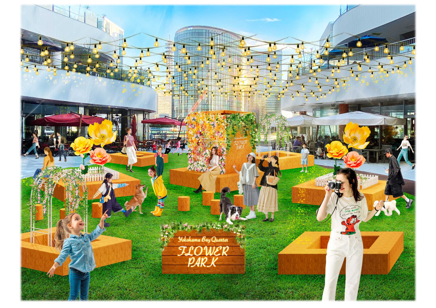 メイン広場にはフラワーウォールやジャイアントフラワーなど、さまざまなお花の演出が出現し、まるで花の公園に迷い込んだかのような華やかな空間が広がります。この季節だけの花あふれる横浜ベイクォーターで、心ときめくひとときをお過ごしください。