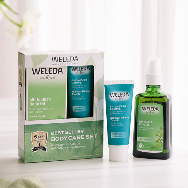 気になる部分の肌を引き締めて、なめらかに整えるホワイトバーチ ボディオイルに、 1本でクレンジング・マッサージ・トリートメントができるスカルプクレンジングのミニサイズ付き。